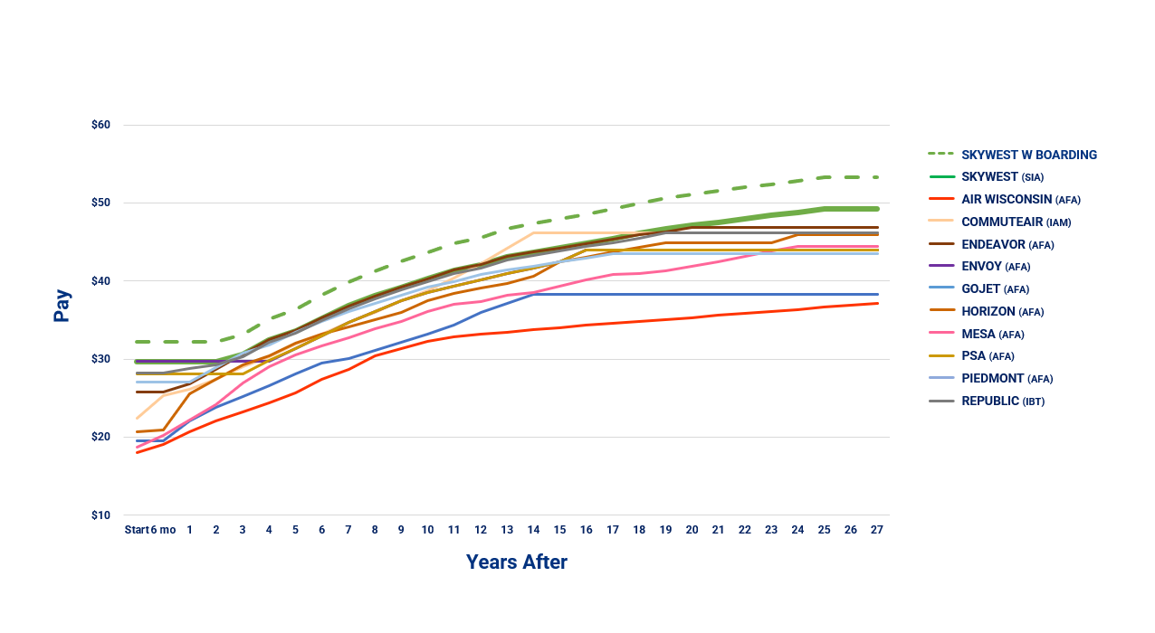 SkyWest flight attendants, through SIA, have secured top-tier and work rules. Most recently in 2023, SkyWest flight attendants secured a 35% increase in starting pay, which increased by nearly 2.5% in 2024 and an additional 3% in 2025.