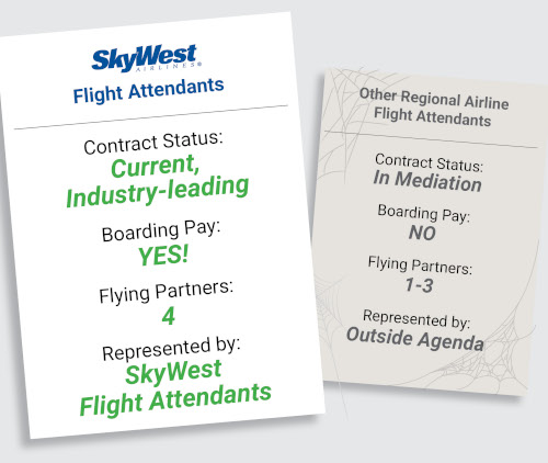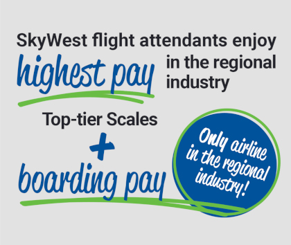 With top overall pay, boarding pay, and the best regional airline work rules, SkyWest flight attendants enjoy the best contract in the regional industry – and that's WITHOUT monthly union dues.