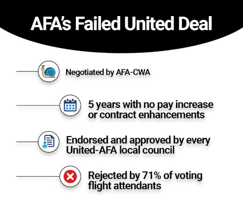 Five years later and STILL no amended contract for United FAs after they strongly rejected the Tentative Agreement that AFA negotiated and endorsed to members for approval. At SkyWest, our ability to work together ensures crewmembers are able to receive regular contract improvements and pay increases.