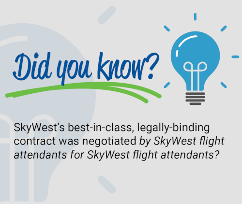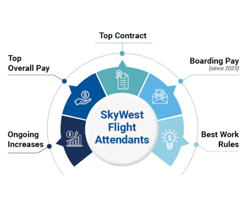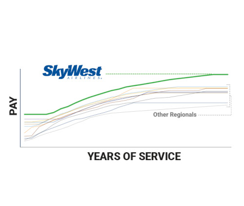In 2023, SkyWest flight attendants secured a 35% increase in starting pay. SkyWest's contract and work rules – including boarding pay and longevity incentive – are unmatched amongst regional flight attendants. That's the power of working together.